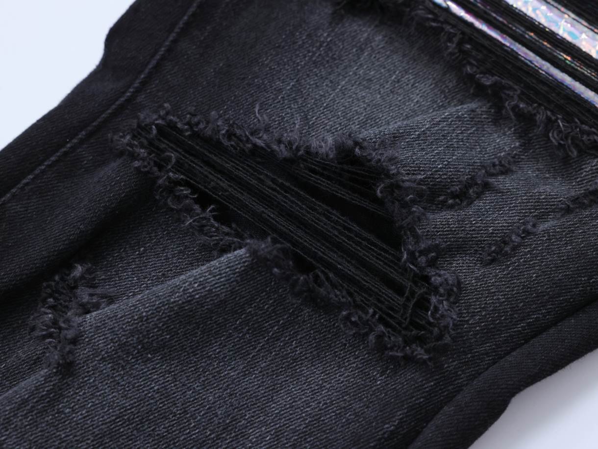 The Amiri Ripp Blue Embroider Black Jeans replica combines rugged style with refined detailing, making them a standout piece for any wardrobe. Featuring distressed rips and intricate blue embroidery on sleek black denim. These jeans emulate the signature edgy aesthetic of the original Amiri designs.