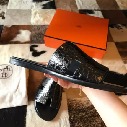 HERMES MEN’S IZMIR SANDALS IN BLACK SHINY NILOTICUS CROCODILE LEATHER – HMSD034