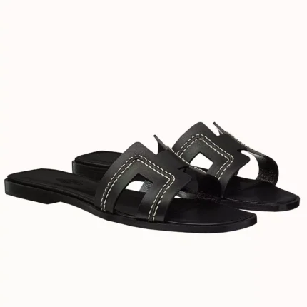 HERMES ORAN SLIDE SANDALS IN BLACK LEATHER WITH STITCHED – HMSD044